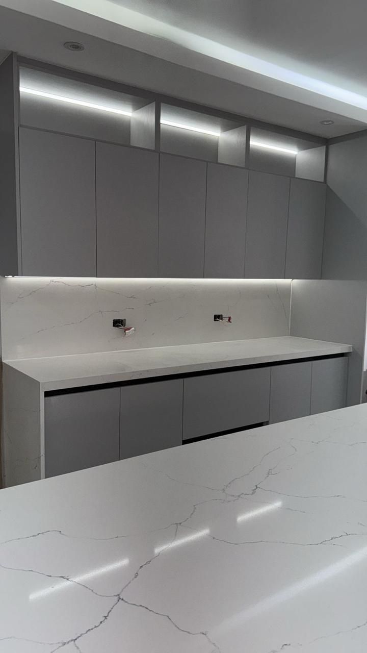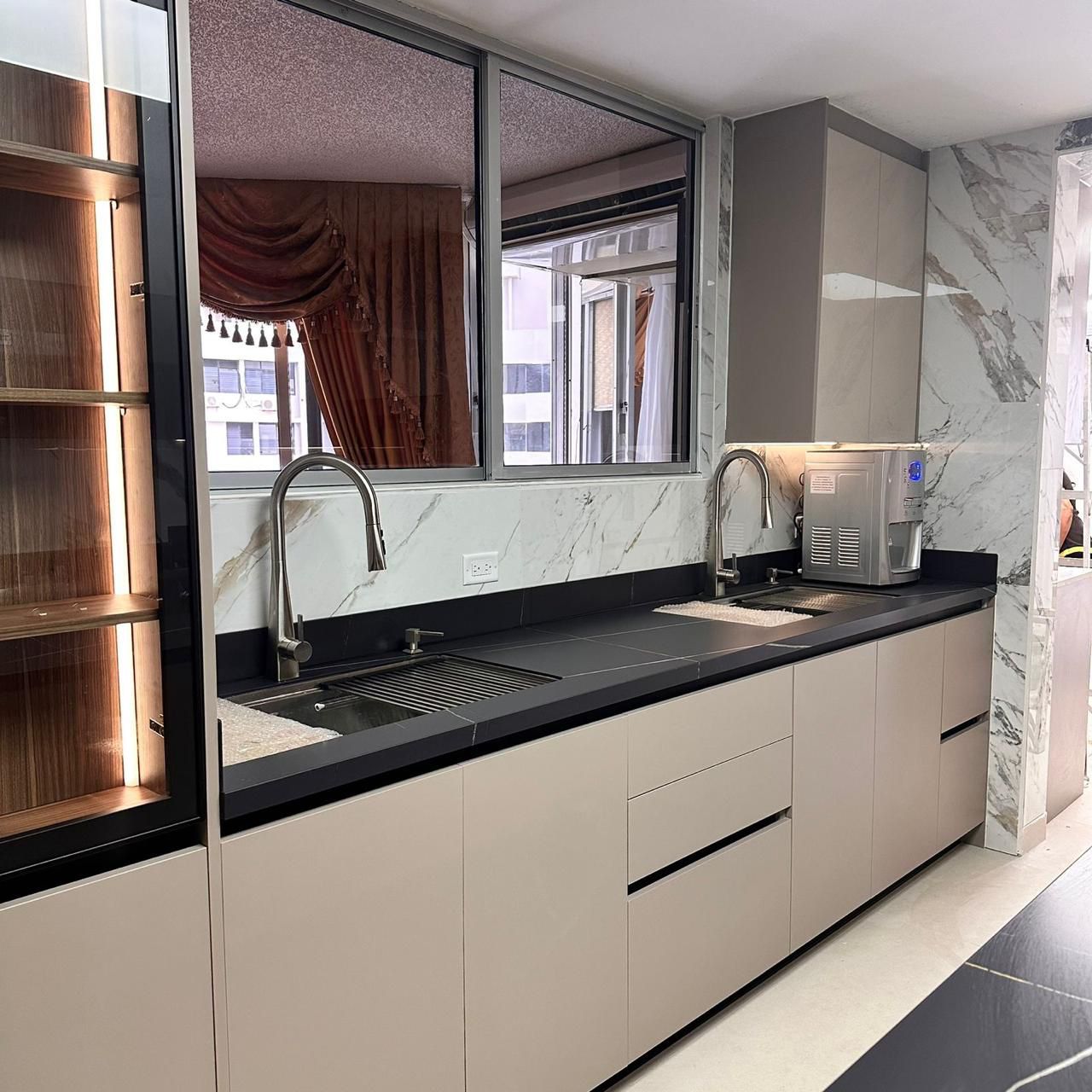 Diseño moderno dónde combinamos melamina Beige mate, cuarzo calacatta negro y vitrina de luces en melamina color Madera, sin embargo, puedes escoger personalmente la combinacion de colores, materiales y texturas que se adapten al estilo que necesites