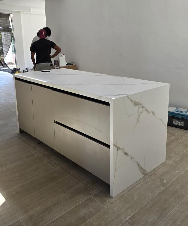 Acá tuvimos que adaptar uno de los hornos mas grandes que habiamos visto (Ja ja) Ilena necesitaba Claridad y le encantó una cubierta ultra Compacto Calacatta Gold, cuando eres exigente, necesitas Calidad y que los materiales sean los mejores, con Blanco Alto brillo y detalles en negro lo logramos, quedó mega Enamorada, estamos preparando un nuevo proyecto en la comuna gracias a ella, Besitos
